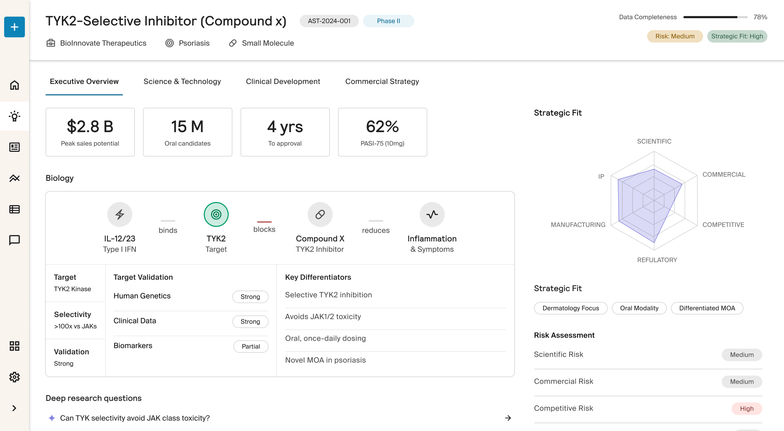The next challenge was judgment. BD described their evaluation process as “an art, not a science.” To bring more consistency, we codified how assets should be assessed: biological fit, modality relevance, clinical impact, market attractiveness, and strategic alignment and broke each into detailed sub-questions to guide decision-making.